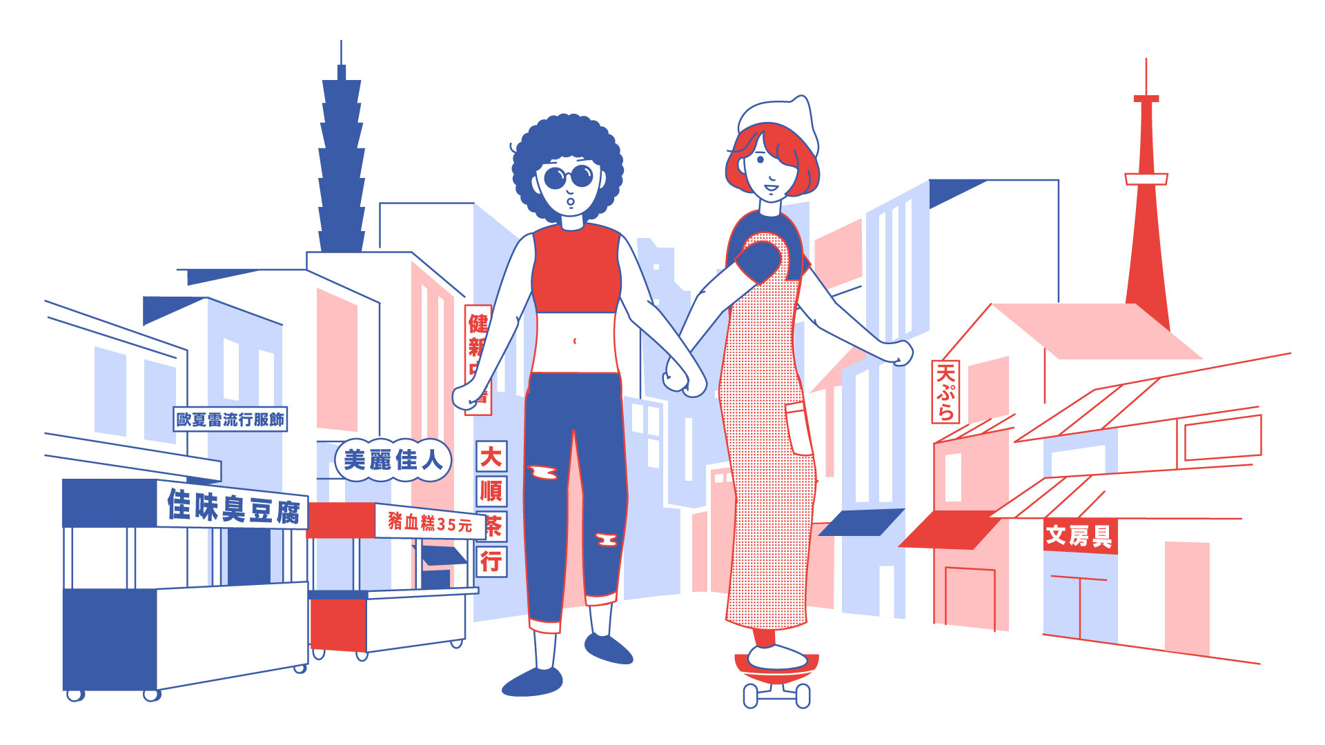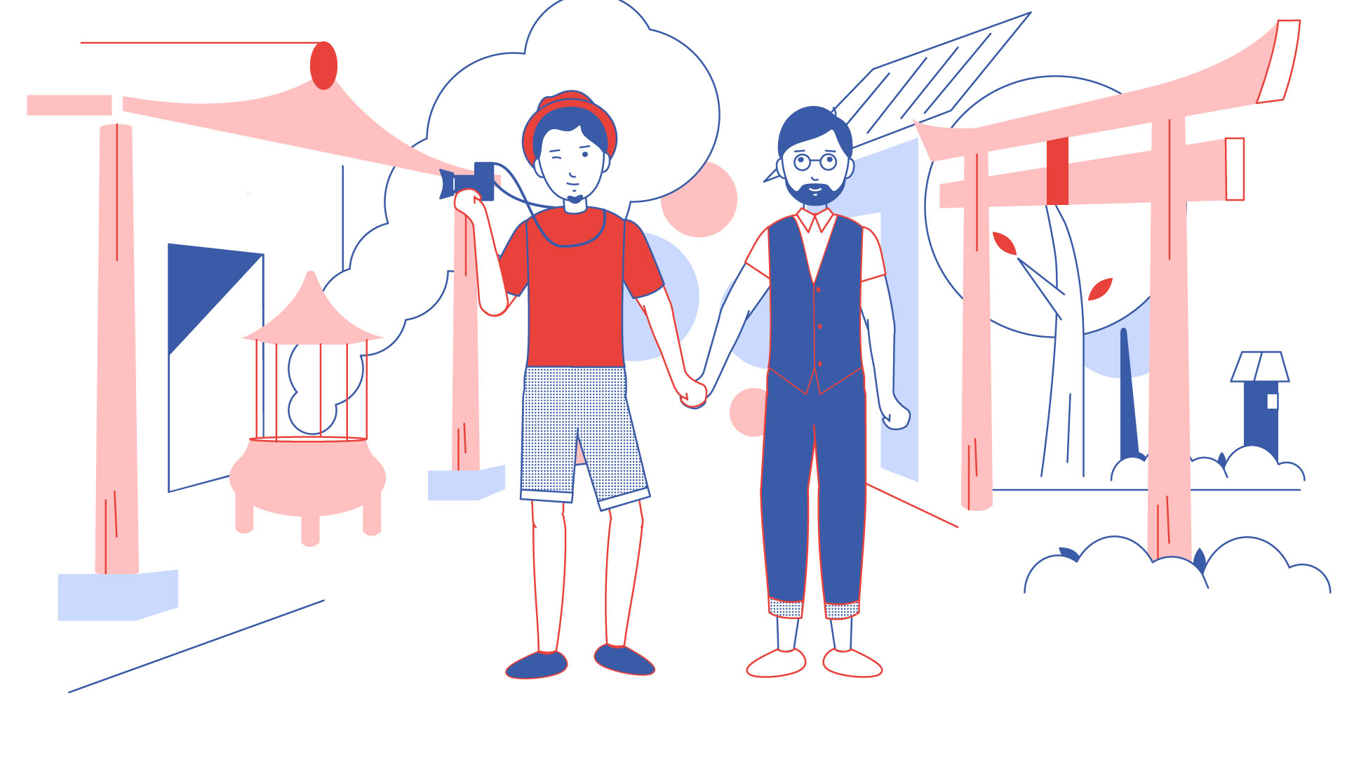 The main storyline for the animation was inspired by two people holding hands. The images on each side are of the two country’s streets, interiors, and countryside. Jump cuts maintain story coherency and depict the mutual support of two people from youth to old age and is a metaphor for the friendship between Taiwan and Japan.